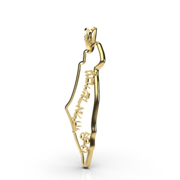A 14-karat gold pendant designed in the general shape of the borders of the State of Israel, with the Star of David symbol combined with the inscription “Am Yisrael Chai”. This is one of the versions that combines a contemporary Israeli patriotic motif with the ancient Star of David symbol. A combination that has recently become a trend in itself and serves as a substitute for the overt use of the Jewish Magen David, which is familiar among Jews in the Diaspora who fear an anti-Semitic environment.