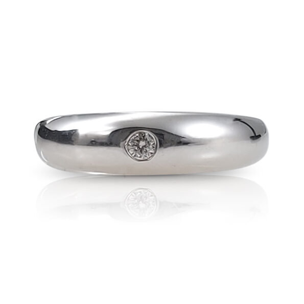 A white gold bezel set ring, weighing 2.80 grams, set with a natural, clean diamond of 0.19 carat.